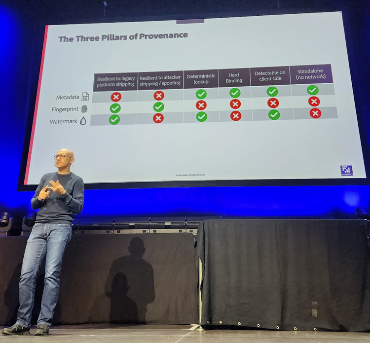 How are you going to tell when something has been created by AI, created by Photoshop, modified, etc? How do you store that persistently and invisibly, so that even after it's been re-shared to Facebook, you know where that JPEG came from?